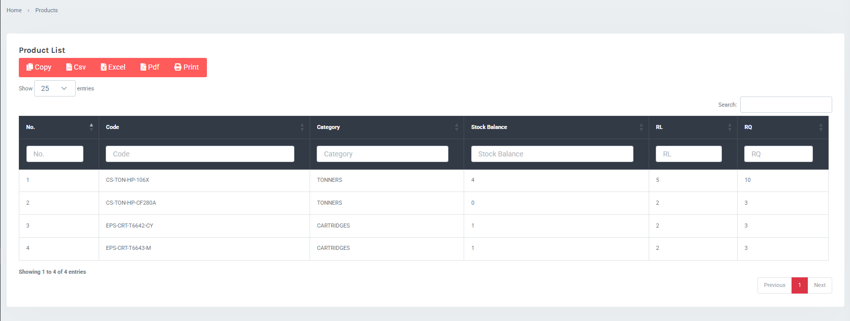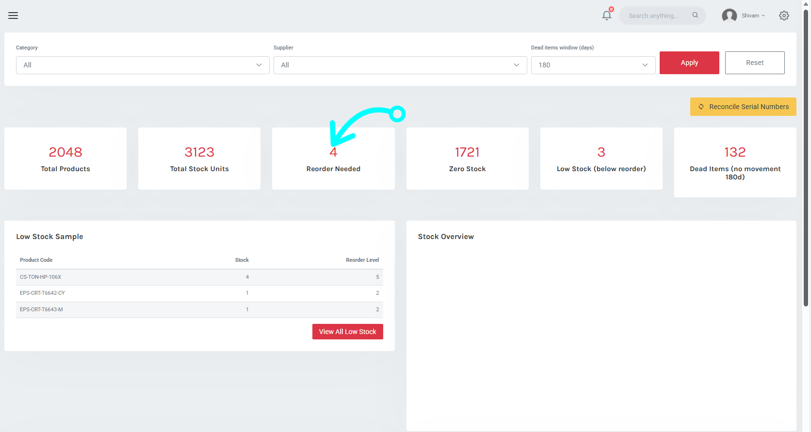 Step 3: Click on the 'Re-order Needed' button and a list of all the stocks that needs re-ordering will appear as show below: